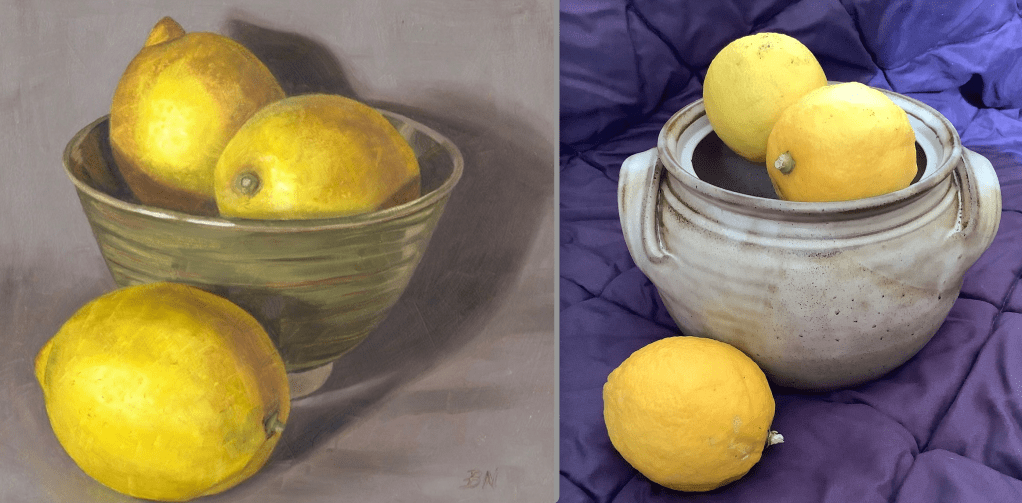 On the left: Still Life with Fruit by artist Belinda Nott. On the right: Lemons from the Garden.