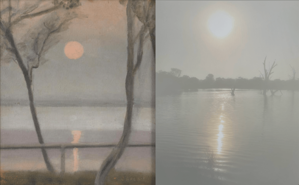 And another Clarice Beckett: Moonlight and Calm Sea beside smokey Sunlight on Lagoon