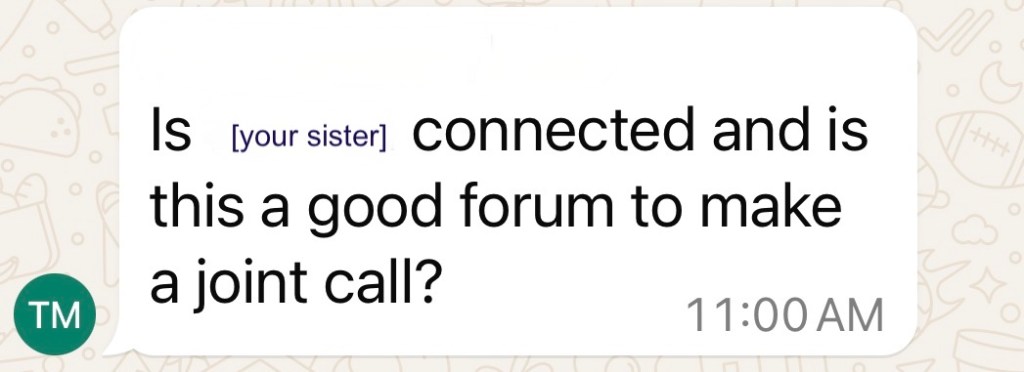 Is [my sister] connected?’ ‘Is this a good forum to make a joint call?’ It can’t possibly be [T]. She never sounds like this. Who is this stranger?