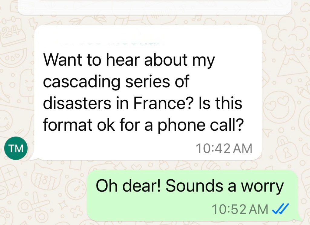 But then a niggling worry set in. What if she really was in trouble and a ‘cascading series of disasters’ had truly befallen her in France? So I sent a message to her husband back home in Victoria, just to reassure myself that the message was safe to ignore.