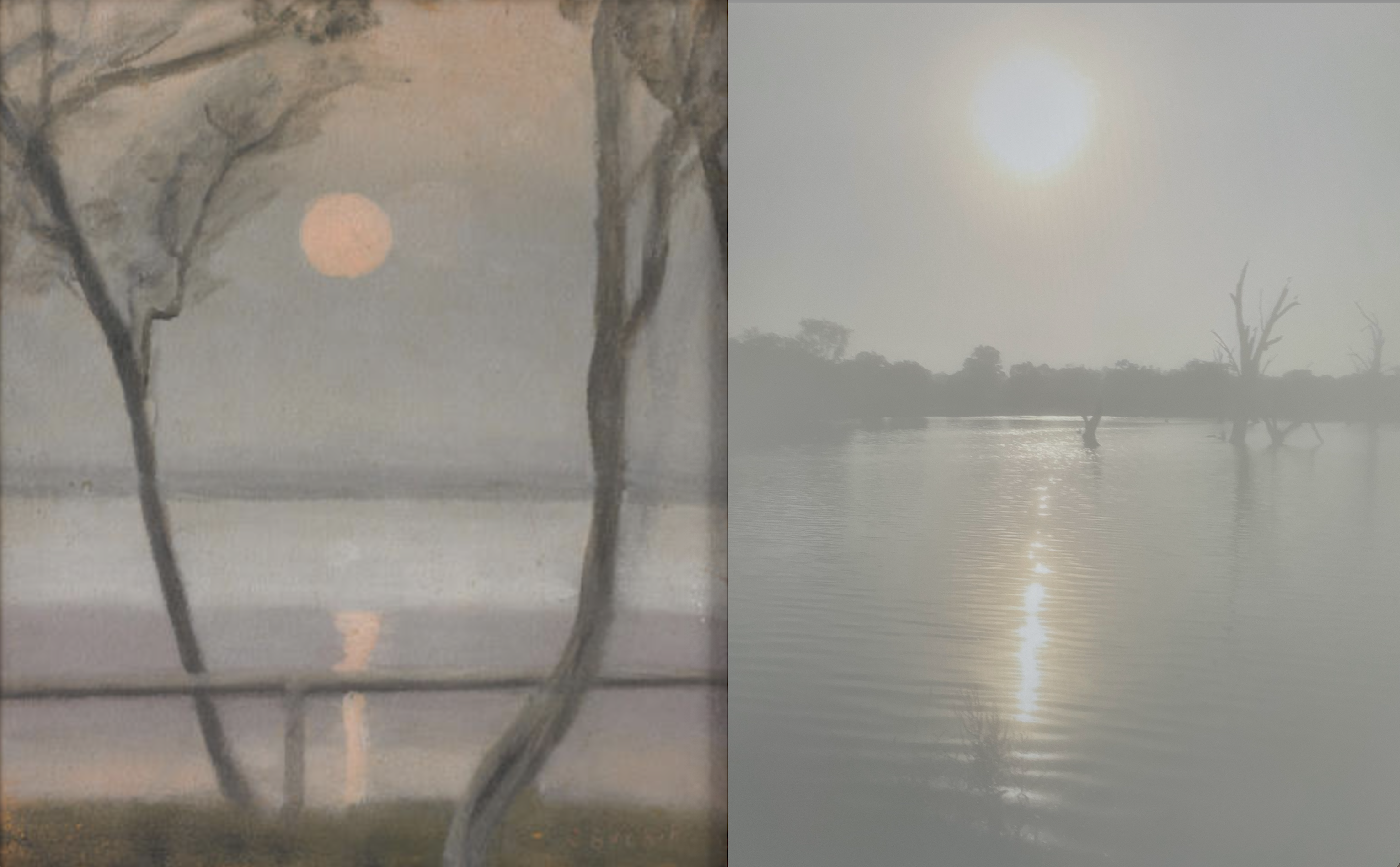 And another Clarice Beckett: Moonlight and Calm Sea beside smokey Sunlight on Lagoon