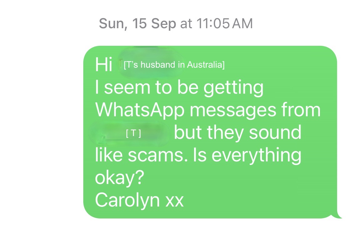 It purported to come from a close childhood friend of my sister’s and mine – we’ll call her [T] – who’d left Australia a few days earlier on her first European adventure to visit her brother in France. But [T] had never contacted me via WhatsApp before, and the words didn’t sound like her, so my scam antennae were quivering.