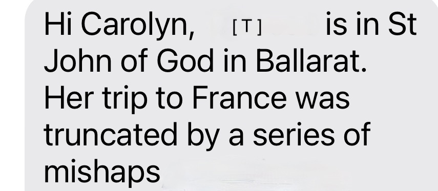 But then a niggling worry set in. What if she really was in trouble and a ‘cascading series of disasters’ had truly befallen her in France? So I sent a message to her husband back home in Victoria, just to reassure myself that the message was safe to ignore.
