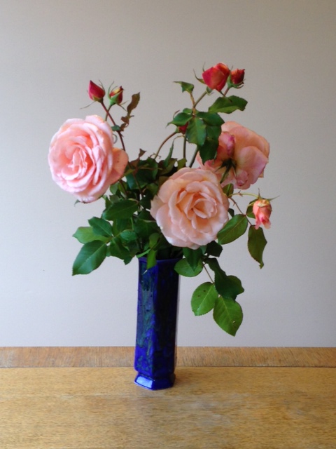Then I noticed from my kitchen window that the last of the Apricot Nectar roses were blooming. Why leave them out in the garden to be ruined by the rain? Isn’t a vase of fresh flowers the ultimate in luxury? And all it takes is some gardening gloves, a pair of secateurs and a little time to provide such an indulgence. Flowers