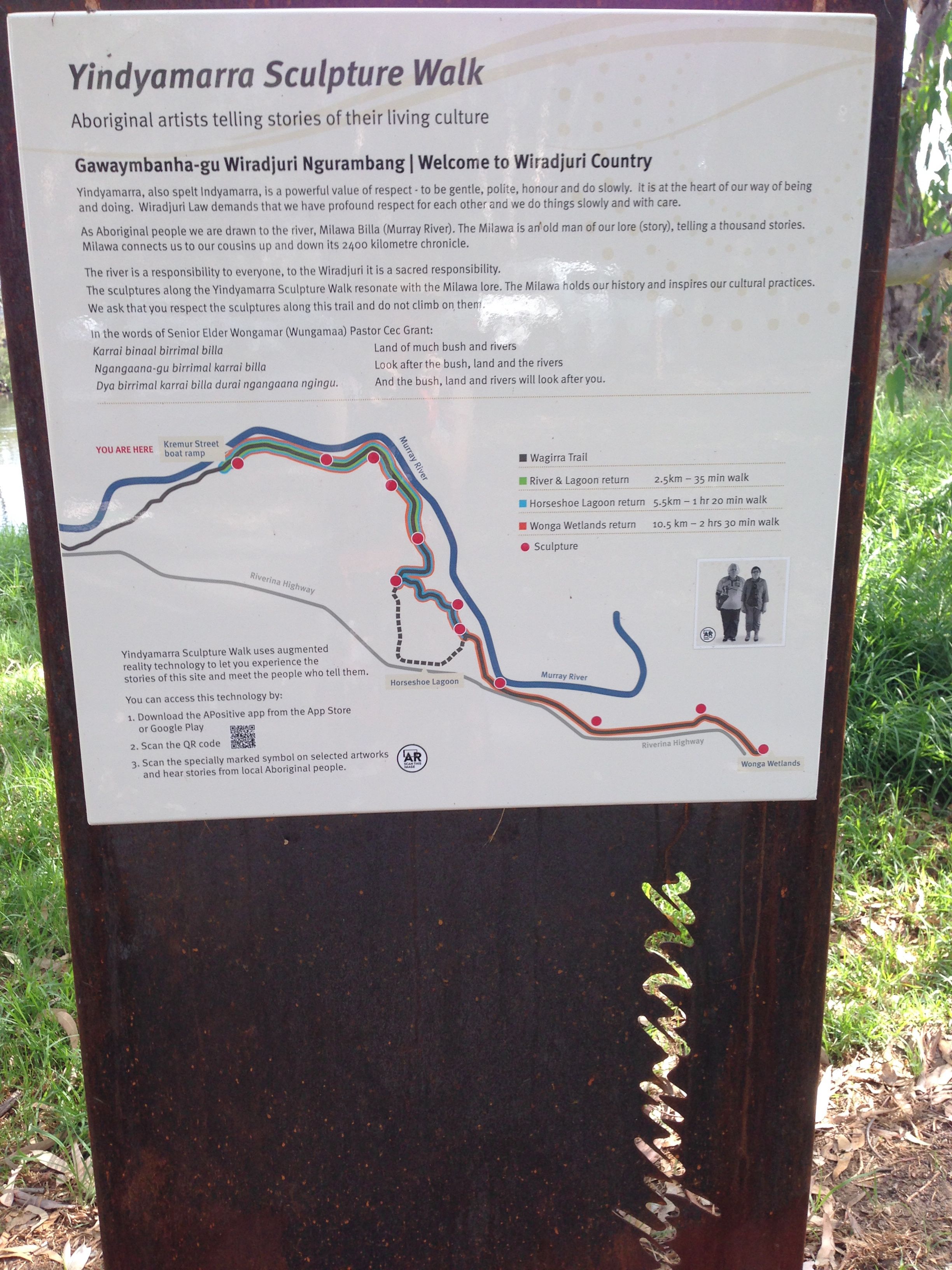 And I was particularly interested to explore our newest addition, a walking/bike-riding trail that meanders along the Murray River and is dotted with the most amazing Indigenous sculptures along its length called the Yindyamarra Sculpture Walk.