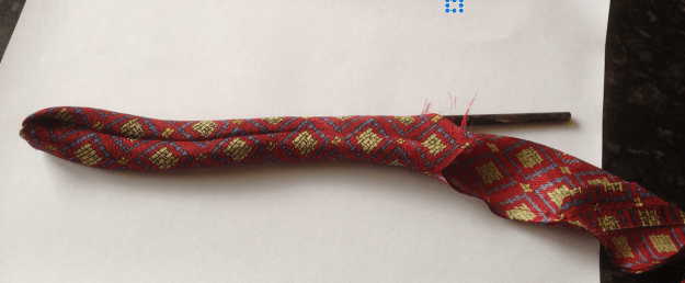 Once the sides and one end have been sewn closed, it’s time to turn the fabric tube inside out. Because it’s silk, it’s nice and slippery, but this manoeuvre is helped with a little patience and by using a chopstick or knitting needle to cajole it through.