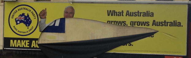 Then there was the hoarding for Clive Palmer’s party, erected recently at the end of my street.