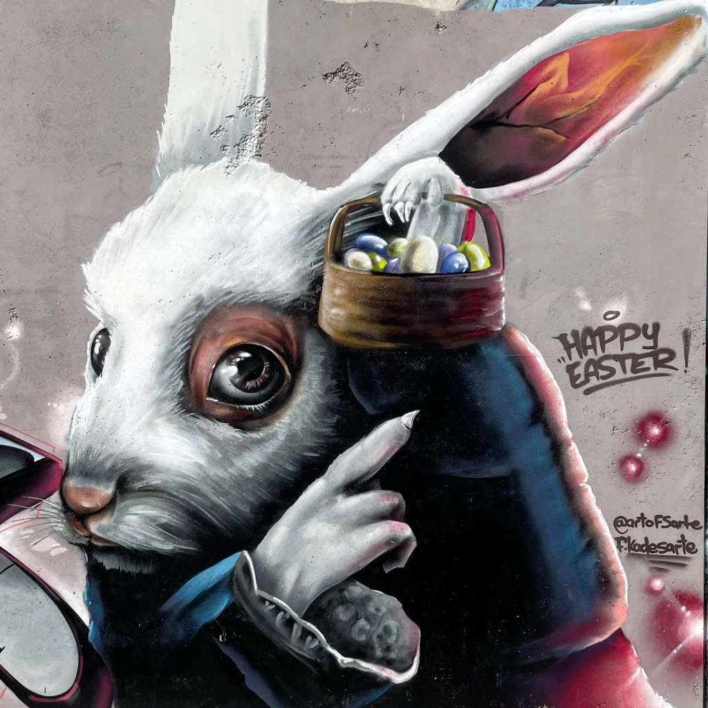 Parking in a side street a couple of weeks before Easter, I came across this cute rabbit painted on an inconspicuous wall.