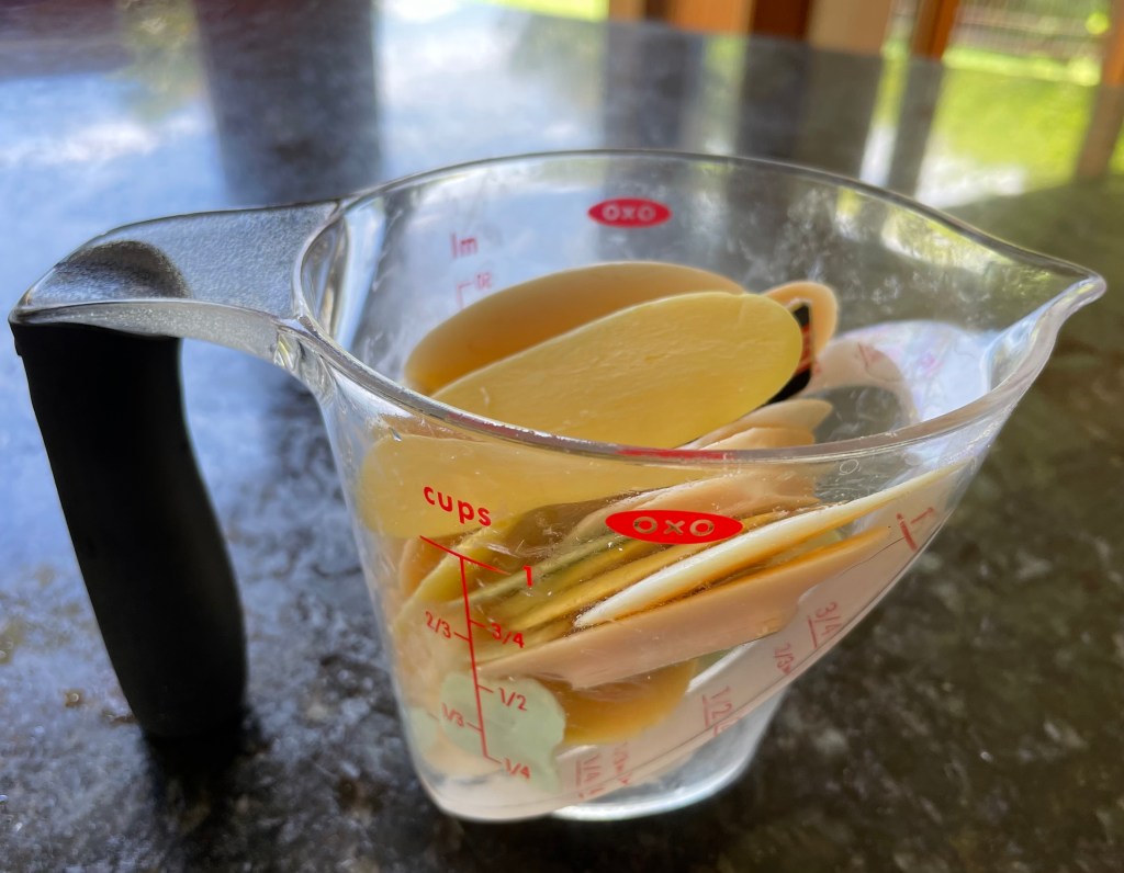 Constructing new cakes of soap out of neglected, leftover shards of old soaps is reminiscent of the sad, lonely, lockdown-type activities of 2020 or 2021, but due to a recent spontaneous fracture in my leg (insultingly called an ‘insufficiency fracture’ as though I neglected to care for my bones sufficiently) I’m on ‘minimal-weight-bearing-until-it-heals’ orders from the orthopaedic surgeon.