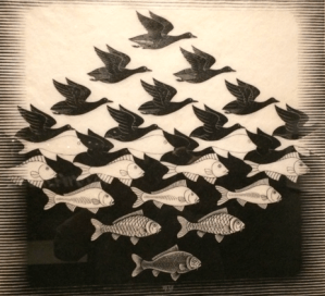 Being more scientifically inclined, I chose ‘Escher and Mathematics’ as my topic. Talk about naive. Escher is mathematics! Why was this information never explained to me in those rudimentary art sessions I had in primary school? Or in the more complex maths classes I enjoyed at secondary level where they didn’t bother to mention there might be a functional aspect to recurring decimals? Like I said—massive gaps in my education.