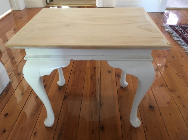 I had an old Queen Anne dressing-table stool of my mother’s which no longer had its dressing-table and so cried out for conversion to a small side table. After removing the cushion insert, my talented Bunnings Buddy was able to make a solid table top for it. All it took was a coat of paint to make it ready to be découpaged: